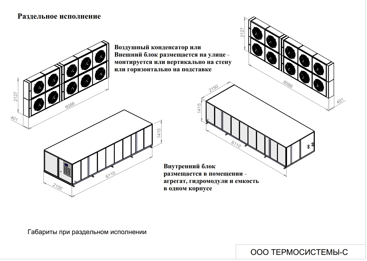 раздельного исполнения - агрегат, гидромодуль в помещении, выносной воздушный конденсатор на улице
